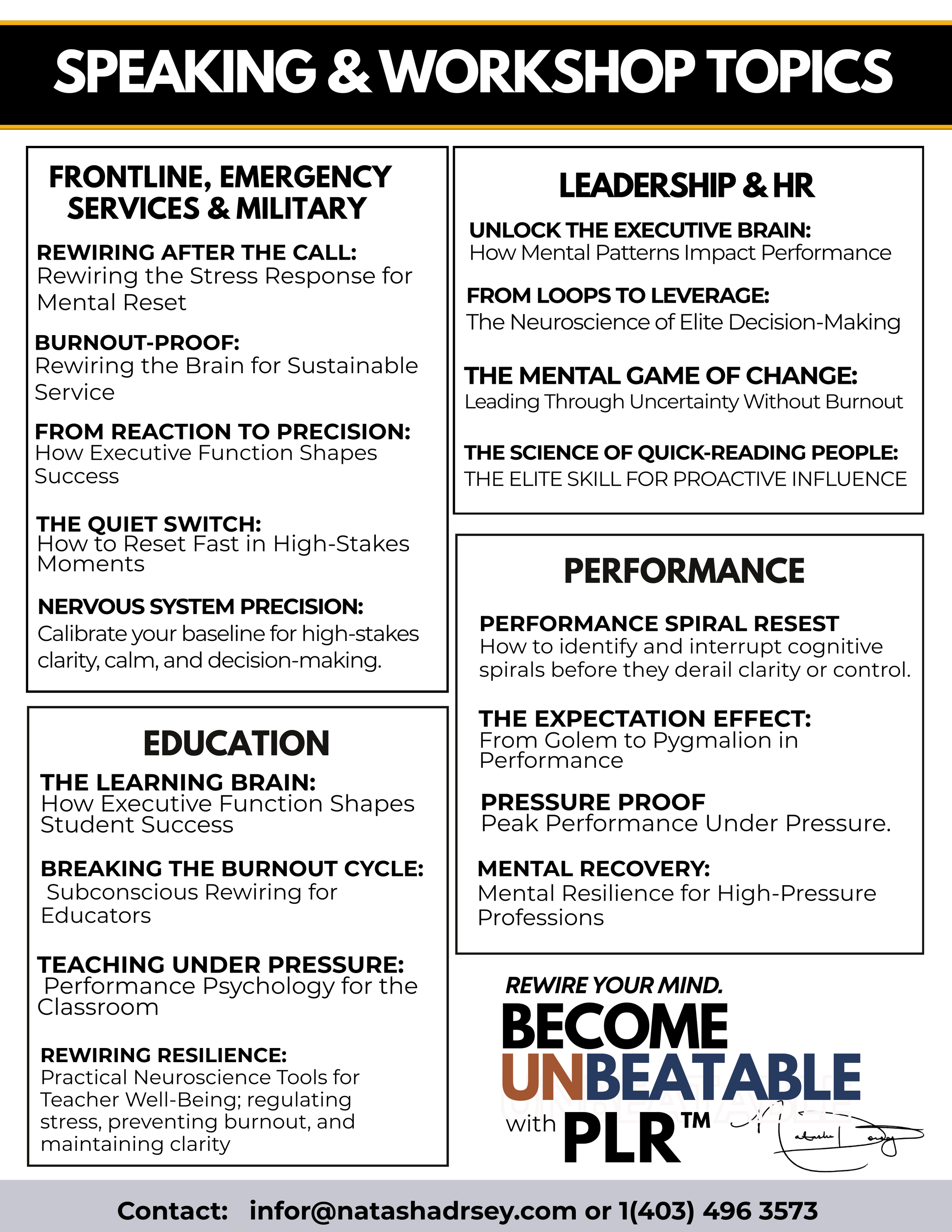 PRL™ is a neuroscience-based framework that rewires subconscious patterns, reframes internal narratives, and restores precision under pressure or frustration. It’s built for leaders and teams who must perform when the stakes are high.