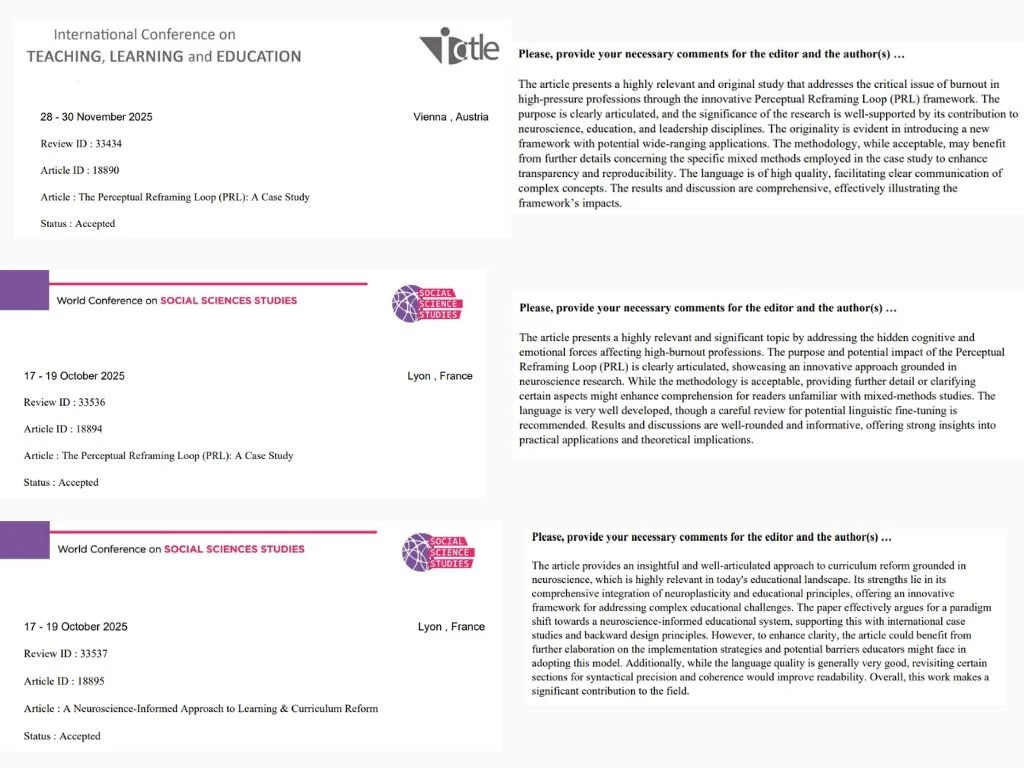 📍 Lyon, France (Oct 17–19, 2025) – presenting The Perceptual Reframing Loop (PRL): A Case Study and A Neuroscience-Informed Approach to Learning & Curriculum Reform at the 8th World Conference on Social Sciences Studies.